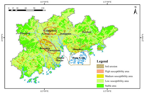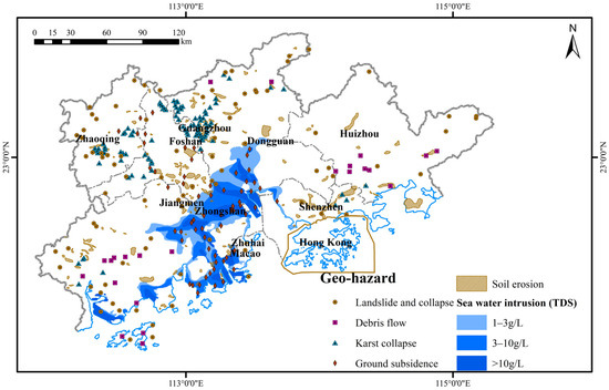 The geological environmental challenges in the study area are predominantly characterized by occurrences of collapses, landslides, debris flows, karst collapses, ground subsidence, and soil erosion, showcasing a widespread distribution (Figure 4). As of 2020, there are 83 locations with landslides and collapses posing a threat to over 100 people, 23 locations with debris flows endangering more than 100 people, and 97 locations experiencing karst collapses. Ground subsidence exceeding 10 cm has been documented in 65 locations. Soil erosion takes the form of a fragmented distribution within the research zone, covering 1.76% of the total study area. Employing a criterion of Total Dissolved Solids (TDS) exceeding 1 g/L, the Pearl River Estuary region experiences a discernible degree of seawater intrusion, affecting approximately 10.87% of the total area. The distribution map of geohazards was provided by the Guangdong Geological Survey Institute.