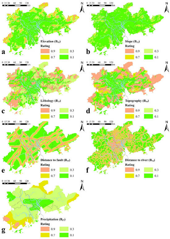Distribution maps of assessment indicators for landslide and collapse susceptibility. (a) Elevation, (b) Slope, (c) Lithology, (d) Topography, (e) Distance to fault, (f) Distance to river, (g) Precipitation.
