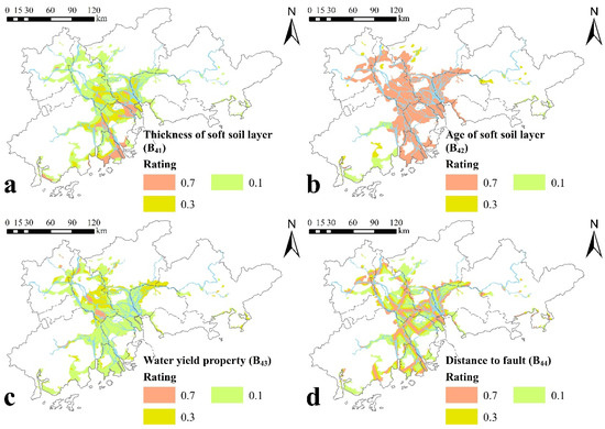 Ground subsidence susceptibility. Ground subsidence refers to the abrupt or gradual downward movement of the Earth’s surface, primarily in the vertical dimension, with minimal lateral shifts [78]. Ground subsidence is frequently instigated by excessive groundwater extraction [79]. A fundamental prerequisite for ground subsidence is the presence of an overlaying stratum of soft soil. The drainage of water from the soft soil results in diminished pore water pressure and amplification of effective stress, leading to the consolidation and densification of the soft soil layer. Crustal movements can also trigger ground subsidence, typically manifesting at a comparably sluggish pace. In this study, the chosen assessment indicators encompassed thickness of soft soil layer, age of soft soil layer, water yield property, and distance to fault [80,81,82,83].