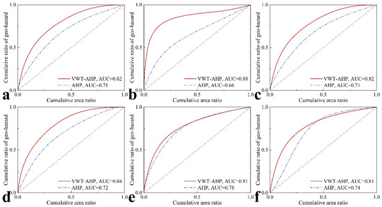The high susceptibility areas are concentrated within three subareas in both the eastern and western sectors, covering a combined area of 3514.68 km2 (Figure 12). Subarea A is located in the southwestern mountainous and hilly terrain of the study area, characterized by prevalent geological formations such as metamorphic rock, clastic rock, and sand shale, with annual precipitation exceeding 2000 mm. Subarea B is located in the northwestern portion of the study area, exhibiting similar topographical and geological conditions to Subarea A. Nevertheless, the precipitation within this area falls below 2000 mm. Subareas C, D, and E are distributed in the mountainous and hilly areas of the eastern part of the study area. The dominant geological formations include metamorphic rock, clastic rock, sand shale, massive rock, and massive lava. The annual precipitation in these subareas ranges from 1600 mm to 2400 mm. In comparison to the other subareas, Subarea C exhibits a denser river network. The medium susceptibility areas and low susceptibility areas are primarily situated around the high susceptibility areas, covering an area of 9848.89 km2 and 9688.68 km2, respectively. The stable areas are extensively distributed across low-altitude tablelands and plains, encompassing an area of 18,645.75 km2. These areas feature widespread occurrences of mucky soil and cohesive soil, dense river networks, and precipitation predominantly below 1600 mm.