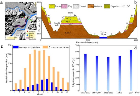(a) Heitai Yellow River terrace in the Loess Plateau region. (b) Typical terrace profile and stratigraphy. (c) Average monthly rainfall and evaporation. (d) Average annual irrigation volume (from the Geological Environmental Monitoring Institute of Gansu Province and the Heitai pumping station). II–V refer to terraces II to V of the Yellow River.