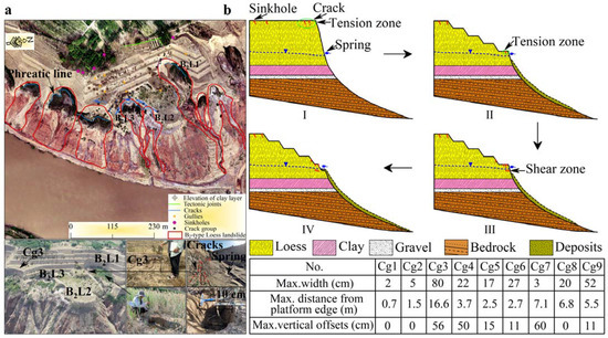 Type B2 landslides (location shown in Figure 2). (a) Field investigation of typical B2L1 and B2L2 landslides, including crown crack groups, sliding areas, sliding surfaces, spring lines, springs, and small deformation failures in the lower part of the slope. (b) Type B2 landslide failure mode. Cgn stands for crack group, gn for the No. of the crack group. I to IV represent the evolution of type B2 landslides on terraces.