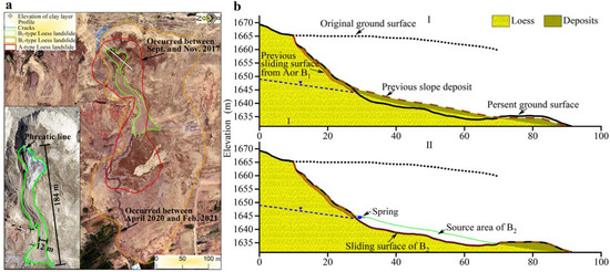 Evolution of landslide failure modes. (a) Type A and B1 landslides occurred successively at this location prior to the B2 landslide. (b) Geological profile. At present, type B2 landslides are appearing in areas (II) where type A and type B1 landslides were prevalent (I).