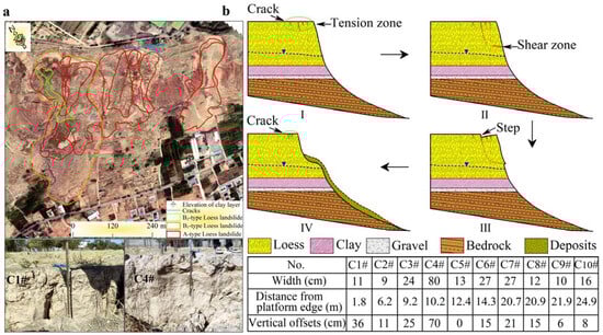 The results of our field investigations indicated that cracks in the crown prior to the occurrence of type A landslides usually also tended to occur in groups. As shown in Figure 6a, their widths ranged from approximately 9–80 cm, with vertical offsets of approximately 0–70 cm, at distances from the platform edge of approximately 1.8–24.9 m. In addition, unlike the type B landslides, no phreatic lines were observed on the type A landslides, and the failure surfaces of the landslides were within the unsaturated zone. It is noteworthy that in the area where previous type A landslides were concentrated, phreatic lines can now be observed in the lower part of the slide area; this may be related to a localized rise in groundwater level at the platform edge owing to the type A landslides blocking the previous spring discharge; alternatively, the landslide failure mode may have transformed and type B landslides began to develop (Figure 5a).