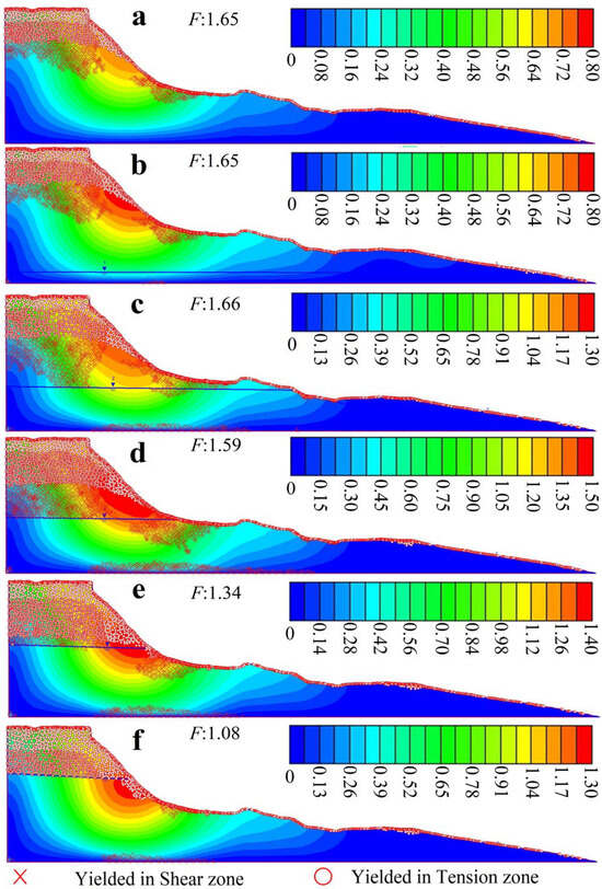We analyzed the possible change characteristics of the yield zone during the rise in groundwater level. In the initial stage of the rising groundwater level (Figure 7a,b), the yield in the tension and shear zones remained almost unchanged; then, as the groundwater level rose, the yield in the tension zone of the crown extended to deeper layers, and the yield in the shear zone of the lower slope extended towards the upper slope (Figure 7c) and deeper layers (Figure 7d); as the groundwater level continued to rise, the yield in the tension zone of the crown further extended to the deeper layer, while a reduction in the yield in the shear zones was observed, which may be related to locations where the stress conditions for yielding were exceeded, or conditions for failure were met, owing to a continued increase in pore water pressure. The marked extension of the yield in the tension zone to the lower part of the slope may also indicate that the part of the lower part of the location has reached a state of failure (Figure 7e). As the groundwater level rose still further, the stress conditions for failure were met over a larger area of the lower slope, and the yield in the tension zones of the crown and slope surface extended further into deeper layers and lower parts of the slope, respectively, suggesting that the slope was about to enter a state of total failure (Figure 7f).