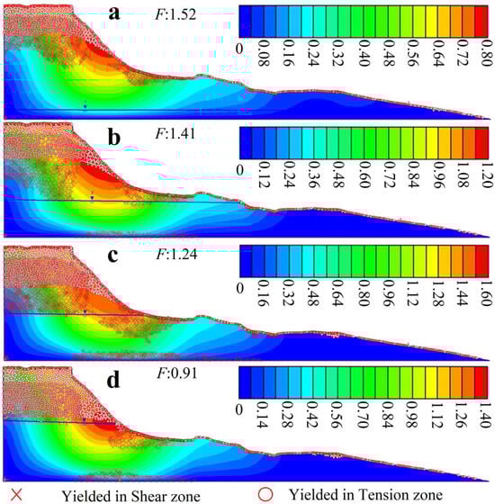 Compared with Figure 7 and Figure 8, Figure 9 shows that a consideration of both the rising groundwater and soil strength attenuation resulted in the slope more easily meeting the conditions for failure. With an initial rise in groundwater level and attenuation of soil strength, the yield in the tension zone of the crown extended to deeper layers, and the yield in the shear zone of the lower part of the slope extended towards the upper slope and deeper layers (Figure 9a–c). With a further rise in groundwater level and attenuation of soil strength, the yield in the tension zone of the crown expanded markedly into deeper layers, and a reduction in the yield in the shear zone of the lower slope was observed, which may again be related to locations where the stress conditions for yielding were exceeded, or conditions for failure were met. Combined with the substantial extension of the yield in the tension zones to the lower part of the slope, the slope may have entered a state of total failure (Figure 9d).