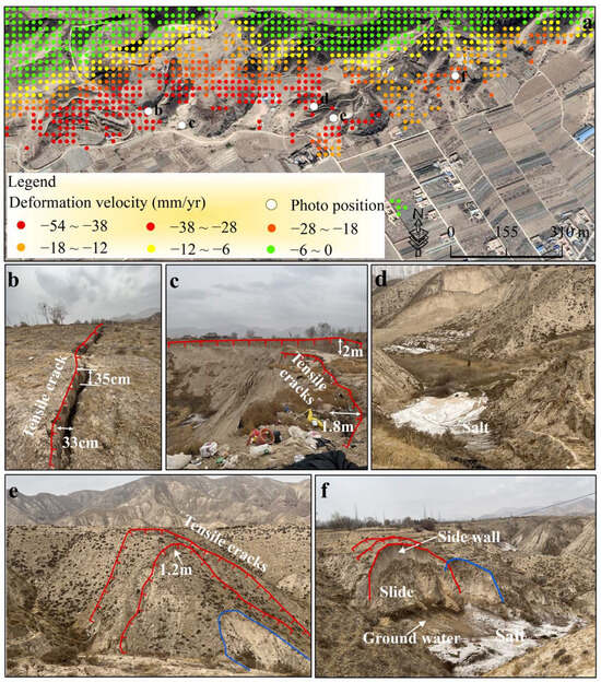 The group of Dangchuan landslides. In the group of Dangchuan landslides, one slide with a sliding distance of 782 m occurred on 29 April 2015, resulting in the destruction of houses, factories, cultivated land, and roadways. The most recent activity occurred on 27 January 2021. Currently, the Dangchuan landslide group persists with strong activity, with annual deformation rates ranging from −32 mm to 7.6 mm. The deformation of the previous sliding source area exceeded the InSAR monitoring range, resulting in a decorrelation phenomenon (missing monitoring points) (Figure 11a). Field observations revealed that the arc-shaped tension cracks developed at the landslide crown were the most significant deformation feature of the group of Dangchuan landslides and that the morphological parameters of the cracks near the platform margin were the most complex, exhibiting the greatest crack distribution density, width, length, and vertical offset (Figure 11b,c,e). Distant from the platform’s edge, the sinkholes are observed to be evolving into cracks (Figure 11d). Moreover, spring activity persists at the foot of the slope, and our previous research confirmed that the loss of soluble material via the spring is positively correlated with slope deformation (Figure 11f) [35].