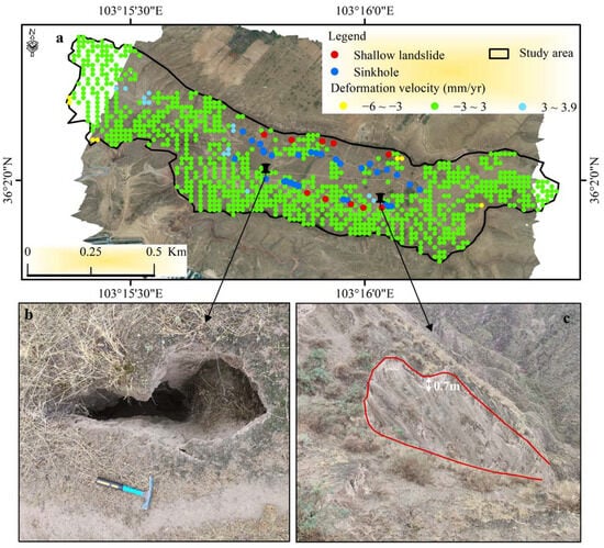 (a) Average annual deformation rate of Sanmaxiaotai terrace (stability threshold is −3 to 3 mm/year; data period is 24 February 2017 to 1 April 2021). (b) A sinkhole. (c) A shallow landslide with a depth of approximately 0.7 m.