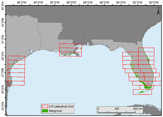 The 0.5° latitudinal zones in Florida, Louisiana, and Texas created for mangrove forest distribution and change analysis.