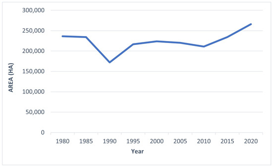 We generated a matrix reflecting shifts between different land cover classes. This was carried out at five-year intervals spanning from 1980 to 2020. The selection of a five-year time frame was driven by several factors: (i) the limited availability of cloud-free, high-quality images in the region, particularly during the early years of the Landsat archive, and (ii) the need to establish a consistent time series for the entire geographic area.