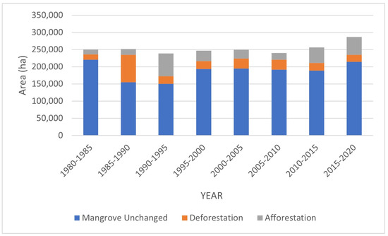 Figure 5 depicts the acreage of mangrove forest regions that remained unaltered, underwent deforestation, and experienced afforestation at five-year intervals spanning from 1980 to 2020. During each of these periods, more than 85% of the mangrove areas displayed constancy, except for the time frame between 1985 and 1990, where only 66% of the forests remained unchanged. Notably, the alteration patterns of both deforestation and afforestation areas varied across each era. Deforestation is characterized by the shift from mangrove to non-mangrove or from mangrove to water, while afforestation pertains to the transformation from non-mangrove to mangrove or from water to mangrove.