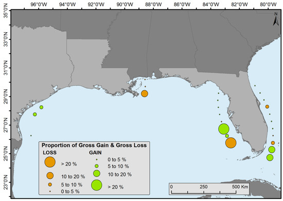 The observed changes, encompassing both deforestation and afforestation, exhibited irregularity along the latitudinal grid. Both mangrove expansion and reduction transpired across all latitudinal segments. Nevertheless, the alterations were more conspicuous in certain regions compared to others, as depicted in Figure 6.