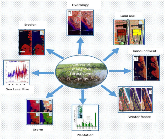 Various factors, including but not limited to winter freeze, storms, land-use practices, hydrology, erosion, impoundment, sea level rise, and human plantation efforts, frequently contribute to alterations in mangrove forests (as illustrated in Figure 7). The influence of these factors is contingent upon the geographical areas in question (15), often with multiple factors concurrently shaping the observed changes.
