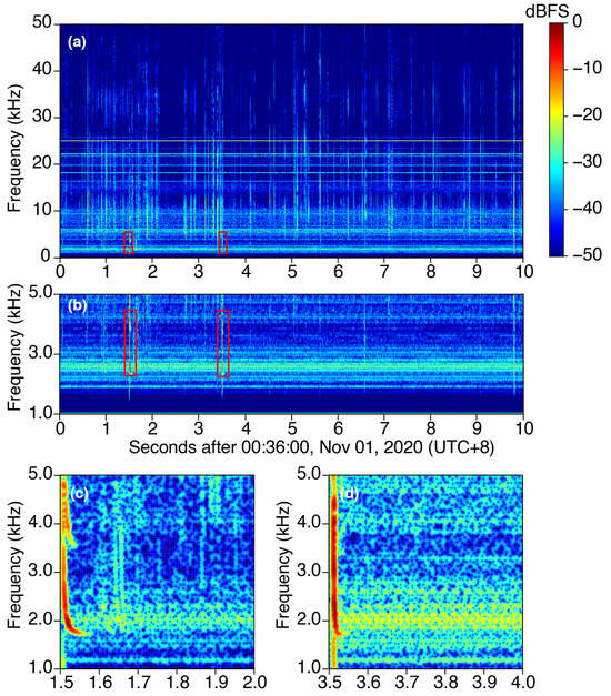 A typical spectrogram of VLF data measured at the Suizhou station between 00:50:00 and 00:50:10 LT (local time in Suizhou, UTC+8) on 1 November 2020. (a) Spectrogram of the 10-s raw VLF data. Zoom-in view of the VLF spectrogram at frequencies of 1–5 kHz (b) between 0 and 10 s; (c) between 1.5 and 2.0 s; (d) between 3.5 and 4.0 s. The tweek signals are marked using red boxes in the upper two panels.