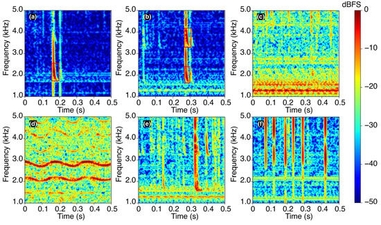 The most prominent feature of tweeks is the tail-like structure (denoted as the “tail” in the following) caused by the temporal dispersion of electromagnetic waves with different frequencies propagating within EIWG. Different from the model of Maslej-Krešňáková et al. [38], which uses the entire signal as the detection target, we use the tail as the detection target in this study. Figure 2a,b shows typical tweek signals; the dispersive tails are manually labeled and used as the training object in the detection model. In addition to tweeks, we have included some common types of VLF spectrograms during quiet-time conditions as negative samples, as well as noise signals, in the dataset. Figure 2c shows a spectrogram image of band-limited noise, which is often observed at frequencies of 1–2 kHz in the VLF data. Figure 2d shows a spectrogram image of wave-like noise, which most likely originates from some artificial interference. Although this kind of noise is uncommon, a quarter of this signal appears to be similar to tweeks after a rotation of 90° in either the clockwise or counterclockwise direction. This could somehow mislead the detection model. Figure 2e shows a spectrogram image of the tweek signals, but, different from Figure 2a,b, this signal is distorted and, thus, not considered a target signal. Figure 2f shows a typical spectrogram of lightning sferics. Note that lightning sferics are not as dispersive and do not contain the tail of tweek signals. These types of signals are included in the dataset in order to enhance the robustness of our model.