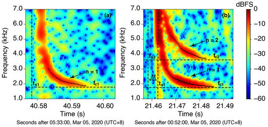 The tracing process is explicitly conducted with the following steps: (1) for the first-order mode tweeks, the first time stamp, at which the maximum spectral intensity in the range of 1.5–3.0 kHz is greater than a threshold value of −20 dB, is recorded as . The first spectral peak is recorded as (), where is the frequency corresponding to the maximum spectral intensity at ; (2) we then search forward in time and find out all pairs of spectral peaks () until the spectral intensity is less than −20 dB. The mean value of the frequencies corresponding to the last five data points is chosen to be the cutoff frequency for the n-th mode. An example of this sequence of spectral peaks is shown using black points in Figure 4a. In this case, 28 spectral peaks were extracted for a first-order mode tweek and the cutoff frequency was 1.89 kHz.