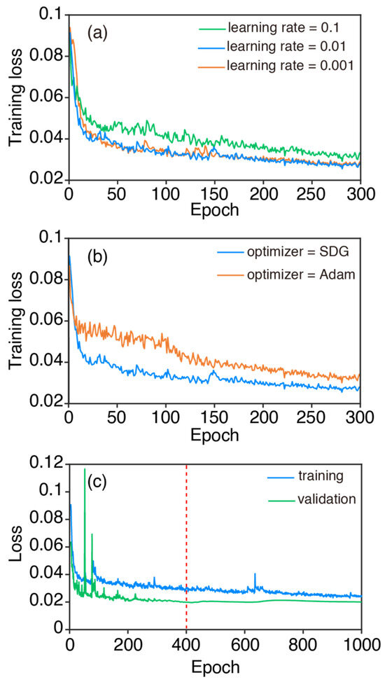 Loss of training obtained with different hyperparameters. The training loss is estimated using the training set, and the validation loss is estimated using the validation set. (a) The training loss for the learning rates of 0.1, 0.01, and 0.001; (b) the training loss for the SDG and Adam optimizers; (c) the training and validation loss for epochs of 1000 with the red dot line marking the 400 epoch.