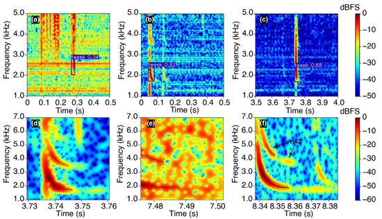 Similarly, we traced the second-order mode tweeks. First, the time with the highest frequency in the range of 3.0–5.5 kHz and within five time-steps of was regarded as the start time . We then search forward in time and find out all the pairs of spectral peaks until the spectral intensity is less than −20 dB. Figure 4b shows an example of the tracing results for both the first-order and second-order tweeks; 49 and 37 spectral peaks were found for the first-order and second-order modes, respectively. The cutoff frequency was found to be 1.81 kHz and 3.72 kHz for the first-order and second-order modes, respectively.