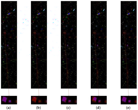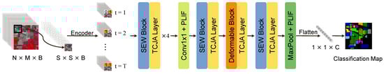 ). Regarding OA, the TCJA layer method used in SEW + TCJA and the proposed model achieves 10.24% and 10.41% improvement than SEW and SEW + DEF, respectively. Furthermore, the deformable CNN method used in SEW + DEF and the proposed model obtain 0.63% and 0.8% advances compared with SEW and SEW + TCJA, respectively. The classification maps are shown in