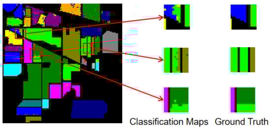 Figure 10 shows the classification maps of our model and others for comparison. Our model achieves the best OA (99.16 ± 0.003%), which is 0.34% higher than the best CNN-based model (A2S2KResNet) and 4.58% higher than HSI-SNN. In addition, the proposed model also achieves the biggest