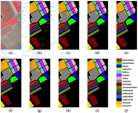 Table 9 shows the results for the SV data set. The proposed model achieves the best OA (99.03 ± 0.002%), which is 5.45% higher than the best results of the other models. And the proposed model also obtains a higher AA (99.28 ± 0.001%) and