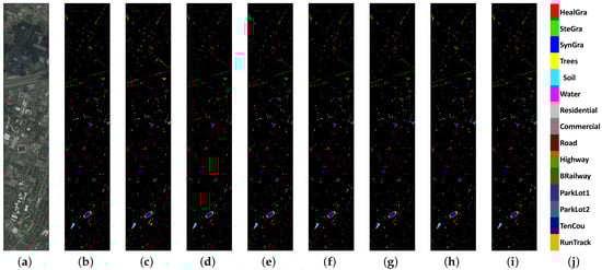 Table 10 shows the classification results of the ablation experiments over HU data sets. Compared with SEW, SEW + DEF, SEW + TCJA, and the proposed model produce notable improvement in all of the three matrices (OA, AA, and