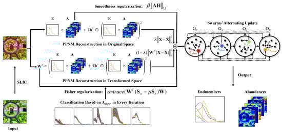 The PPNM is used to explain the nonlinear mixing effects. After superpixel-based Fisher transformation is incorporated into the process of unsupervised nonlinear unmixing, hyperspectral data are required to be approximately reconstructed in both the original spectral space and the transformed feature subspace. Thus, the final mathematical problem of nonlinear unmixing accounting for spectral variability can be formulated using: