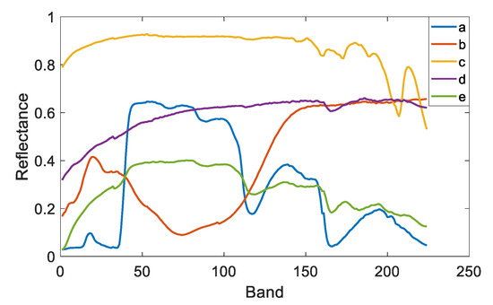 To quantitatively compare the unmixing accuracy, synthetic datasets with different noise intensities, numbers of endmembers, and numbers of pixels were generated. Five endmembers were selected from the USGS spectral library (available at http://speclab.cr.usgs.gov/spectral-lib.html (accessed on 1 April 2023)) as the reference endmembers (shown in Figure 2) where each endmember is composed of 224 spectral bands covering wavelengths from 380 to 2500 nm. Then, the reference endmembers were multiplied with randomly generated scaling factors in the range to model SV for each pixel [37]. Abundances were sampled by the Gaussian random field (available at http://www.ehu.es/ccwintco/index.php/Hyperspectral_Imagery_Synthesis_tools_for_MATLAB (accessed on 1 April 2023)) method. The maximum abundance was set as 0.8 to simulate the highly mixed scenarios. Finally, pixels were mixed based on the PPNM with pixel-wise random bilinear parameters in the range , and additive Gaussian white noise was added. For a fair comparison, each method was run ten times independently, and the mean and standard deviation of the unmixing results were provided. The best experimental results are marked in bold.