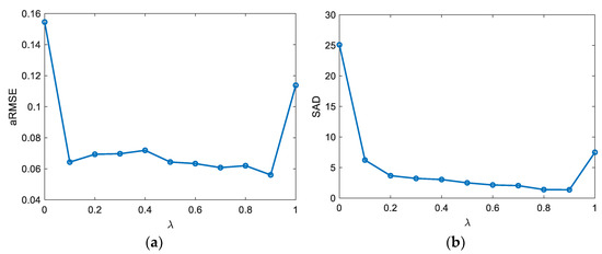 Influence of on unmixing results. (a) aRMSE, (b) SAD.
