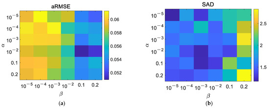 Influence of and on unmixing results. (a) aRMSE, (b) SAD.