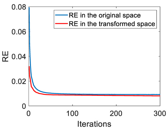 - Fisher Regularization term : The transformation matrix should satisfy the Fisher criterion, i.e.,where scatter matrices and are obtained by (10). in (12) guarantees that the transformation can reduce the differences between pixels of the same class and the similarities between different materials. In contrast to traditional Fisher transformation-based methods calculating in a preprocessing step, our proposed method trains it in an iterative unmixing process. Moreover, to facilitate the optimization of , (12) is rewritten as an approximate equivalent form [52,53]:where denotes the t th column vector of and is a small constant used to balance the contributions of and .
