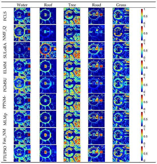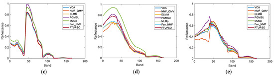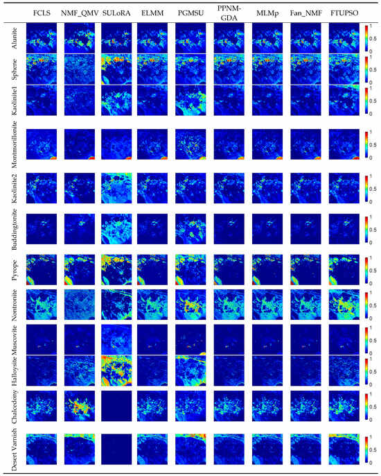 Moreover, Figure 12 depicts the estimated endmember curves, and their corresponding abundance maps are shown in Figure 13. Similar unmixing results are obtained by most methods for minerals including Alunite, Montmorillonite, and Muscovite. SULoRA may overestimate Halloysite and fail to recognize Chalcedony and Desert Varnish because of prominent spectral variability between some minerals (i.e., high similarities of spectral shapes) according to Figure 11. However, the superpixel-based Fisher transformation makes FTUPSO distinguish similar spectra and produce reasonable unmixing results.