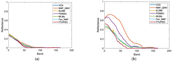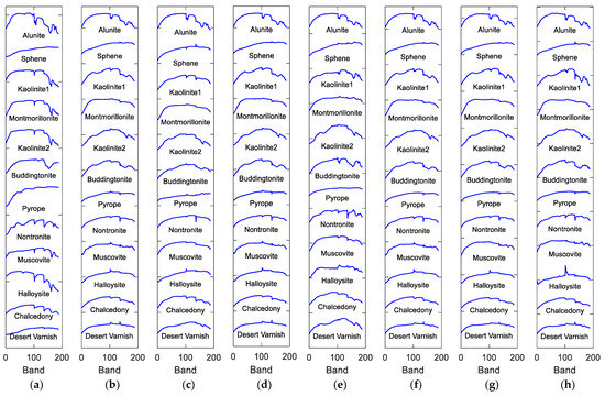 Endmembers of Cuprite data extracted by different methods. (a) Standard spectra, (b) VCA, (c) NMF_QMV, (d) ELMM, (e) PGMSU, (f) MLMp, (g) Fan_NMF, (h) FTUPSO.