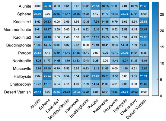 Table 6 compares the REs, SREs, and time costs of the methods. Due to the existence of strong nonlinear mixing effects, nonlinear unmixing methods provided better results (i.e., lower RE and higher SRE) than most linear unmixing methods except ELMM. FTUPSO performs better than the others, and the nonlinearity is well explained by its PPNM-based unmixing modules. Moreover, standard spectra of the USGS library were employed to quantitatively compare the extracted endmembers. Figure 11 provides the SADs between the reference endmembers (shown in Figure 12a) where the high spectral similarity can be observed, e.g., minerals such us Halloysite and Kaolinite have small SADs. Table 7 provides the SADs of the endmembers extracted using the compared methods. Affected by the intimate mixing effects and SV of different minerals, twelve endmembers with the smallest SADs were extracted by different methods. For example, FTUPSO provides the most accurate Alunite, Nontronite, and Muscovite, and Sphene and buddingtonite extracted by Fan_NMF have the smallest SADs.