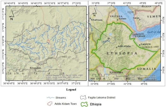 This study was conducted in the Northwestern Highlands of Ethiopia, specifically in Fagita Lekoma District. The total area of the district is 65,579 ha [34], and it is located at 10°56′–11°12′N and 36°40′–37°06′E (Figure 1). The landscape is characterized by rugged and undulating topography, with elevations ranging from 1879 to 2922 m above sea level. Climatic conditions include humid subtropical (Weynadega) and moist subtropical (Dega) agroecological zones, which cover 84% and 16% of the study area, respectively [34]. The mean annual precipitation of the area is 2454 mm yr−1, and the peak rainfall occurs between June and September, with a unimodal rainfall pattern. The mean daily temperature ranges from 15 °C to 24 °C [43]. In 2015, the main types of land use/land cover in the district were cultivated land (56%), grasslands (23%), forests (19%), and urban areas (2%) [34]. In the last two decades, plantation forests have become among the dominant land-use types due to the expansion of Acacia decurrens plantation forests. Acacia decurrens is a fast-growing exotic tree species that is extensively grown in the district by small-scale farmers [44]. Acrisols are the dominant soil type in the district and are characterized as severely weathered, acidic soils [45]. Most of the steep slope areas of the district are covered with Leptosols, which are thin, degraded soils. The district is drained by various streams flowing westward and northeastward to join the Tinbil and Abay Rivers, respectively (Figure 1).