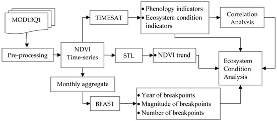 The general workflow of vegetation seasonal and interannual change detection for ecosystem condition analysis.