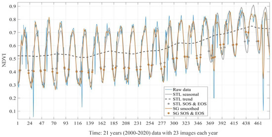 Indicators of seasonal changes in the annual cycle of the NDVI were extracted for the identified vegetation types using TIMESAT. In vegetated areas with similar vegetation types and homogeneous compositions, monitoring indicators of seasonal change using satellite NDVI can prevent the effects of various ground-based observation noises [65]. For each vegetation type, the average value of all identified parameters was calculated from 2000 to 2020. The NDVI value of the study area showed an increase throughout the study period, with variation from season to season observed for most types of vegetation. In Figure 4, the sample pixel (latitude: 11.0453°N, longitude: 36.8631°E) representing an Acacia decurrens plantation in the central part of the study area shows the harmonic model fitted to the NDVI raw values and SG smoothed data across the study period. The trend decomposition of the NDVI shows that there was a remarkable increase, especially starting around 2010 (Figure 4).