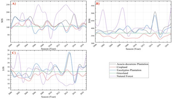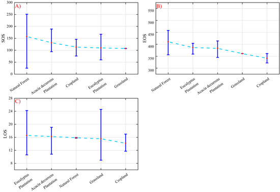 The phenology indicators are shown in Figure 6, using error bar plots, which were sorted according to the mean values, from a larger number of days to fewer. The mean value of SOS was earliest in grasslands, and this proves that grasses were highly responsive to spring rains. In other ways, natural forests require a relatively long time to show growth following the change in season. The EOS of cropland appears earlier, and the EOS of natural forest appears the latest. The observed range of EOS was between 322 and 536. Eucalyptus plantation forests have the largest mean value, which indicates the quality of the species’ ability to continue growing, even in dry months, by extracting underground water using its deep roots. This can be attributed to the fact that the roots of Eucalyptus are long, can grow up to 20–30 feet, and extract more water from the deepest parts of the soil [70]. Cropland exhibited the lowest mean LOS value because the crops were harvested approximately five months after planting. The LOS range for all vegetation types was 8.96 and 24.57, both recorded for natural forests in the 14th and 3rd seasons of the time series, respectively.