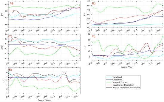 Seasonal parameter values were extracted for the phenology indicators SOS, EOS, and LOS and the ecosystem condition indicators PV, BV, Amp, LI, and SI for distinct types of vegetation: natural forest, Acacia decurrens plantation forest, Eucalyptus plantation forest, grassland, and croplands. The results reveal specific variations in the patterns of the vegetation type responses across the study period. Cropland and plantation forests showed a relatively similar pattern for SOS and EOS. Grasslands showed slight variation throughout the study period for all phenological indicators. The earliest and latest growing events were recorded in natural forests, but the changes from year to year were relatively gradual (Figure 5A). Croplands were the first to be identified by EOS across the entire study period (Figure 5B).