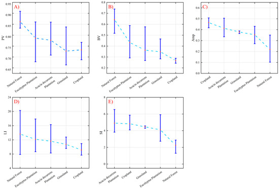 Error bar plot of ecosystem condition indicators: (A) PV, (B) BV, (C) Amp, (D) LI, and (E) SI.