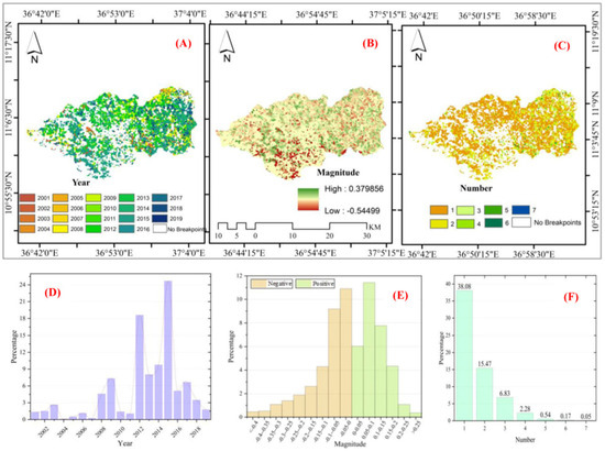 Interannual changes detected using the BFAST algorithm from the NDVI time series data: (A) spatial distribution of the year of largest change; (B) spatial distribution of the magnitude of change; (C) spatial distribution of the number of changes; (D) area percentage of the year of largest change; (E) area percentage of the magnitude of change; and (F) area percentage of the number of changes.