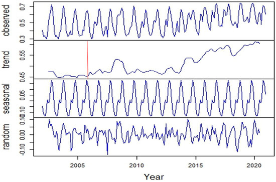 Vegetation indices (VIs) are the most commonly applied data transformation techniques for assessing and monitoring vegetation changes [16], wherein the vegetation signal is enhanced across certain parts of the spectrum, and the data are more valuable when at least two bands are combined into a VI [17]. Likewise, when VI time series are generated, they provide information on the dynamic patterns of vegetation [18]. At this point, the time series can be used to extract useful metrics, such as trends, seasonal variations [19], and abrupt breakpoints [20]. Decomposing time series data into their components allows us to recognize each element of the series independently.