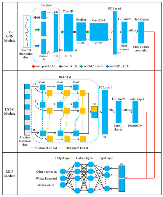 Specifically, the structure of the 1D-CNN module includes an inception module, 2 convolutional layers, and 2 fully connected layers. The inception module can simultaneously obtain spectral features at different time scales and concatenate these features along the same dimension before passing them to the next convolutional layer. To reduce the number of model training parameters and speed up computation, a max-pooling layer with a window size of 2 was added after the first convolutional layer. The first fully connected layer receives the feature information collected by the previous convolutional layer in the form of one-dimensional data, and its size is determined by the dimensions and size of the input data. The second fully connected layer contains a number of neurons corresponding to the number of crop types to be identified. After being processed by the Softmax activation function, the discrete probability values of different crop types for each pixel can be obtained (i.e., soft output).