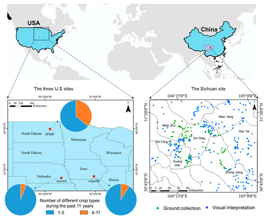 The fusion of spectral time-series data and historical planting data for within-season crop mapping was evaluated in three counties in the U.S. (left) and one cloudy region in Sichuan Province in southwest China (right). At the Sichuan site, we show the spatial distribution of all testing samples generated by both ground collection and visual interpretation.