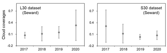 The cloud coverage (mean and standard deviation) in the L30 and S30 images acquired during the period (145–193 DOY) at the Seward site in each year.
