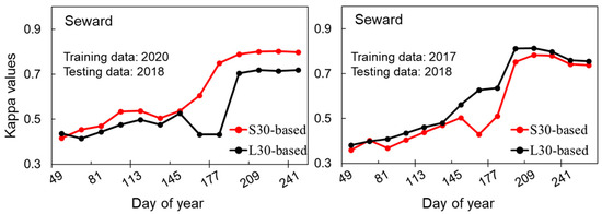 The results from the three remote sensing datasets (L30, S30, and HLS) show similar performances in the later periods of the year but differences in the early periods (Figure 3). In Seward, an obviously drop was observed in the Kappa values of the L30-based classification between 145 and 193 DOY, whereas this abnormal change was not found in that of the S30-based classification. Nominally, S30 time-series data may be less affected by weather conditions because S30 observations are made more frequently than those of L30. We thus investigated the image cloud coverage during this period (145–193 DOY) in each year for L30 and S30 (Figure 4). We indeed observed more serious cloud contamination in L30 images in 2020 compared with other years, and interestingly, we also observed obviously higher cloud coverage in S30 images in 2017. Because cloud-contaminated values were filled by the linear interpolation of the time-series data, the different degrees of cloud coverage may lead to the difference in spectral features between the training and testing datasets, which could explain the observed inconsistency between the two datasets. To confirm this explanation, we conducted a reciprocal experiment, in which crop types in 2018 were estimated by using L30 (or S30) images in 2017 and 2020 as the training data, respectively. As we expected, when using the 2020 data as training data, the L30 classification results showed abnormal fluctuations, while the S30 classification results did not. At the same time, when using the 2017 data as training data, the S30 classification results showed abnormal fluctuations, while the L30 classification results did not (Figure 5). This experiment suggests the importance of ensuring consistency in spectral features between the training and testing datasets, particularly for crop classification in the early season.