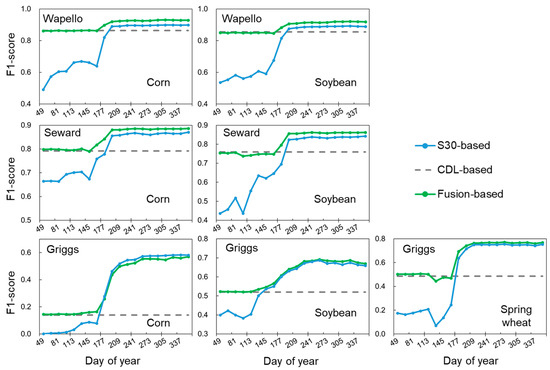 Figure 6 shows the performance of the main crop type identification using the S30 images. Combining the CDL-based with spectral-based classification generated a higher accuracy for corn and soybean identifications at the Wapello and Seward sites. For example, the fusion-based F1 score of corn reached above 0.85 at about 177 DOY at the two sites. For Griggs, the CDL-based, spectral-based, and fusion-based F1 scores showed similar change patterns as the other two sites; however, the CDL-based F1 scores of corn were much lower than that of soybean and spring wheat. We investigated the planting areas for different crop types from 2016 to 2020 in Griggs and found a substantial decrease in the corn planting area in 2020 (Figure 7), which may account for the CDL-based F1 scores of corn being less than 0.2.