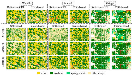The comparisons between the crop classification maps and the reference CDL data are shown in Figure 8. Although the spatial patterns between the CDL-based classification and the reference maps are relatively consistent at the Wapello and Seward sites, the enlarged views of local areas show confusion errors among corn, soybean, and other crops (indicated by red boxes in Figure 8). With the inclusion of spectral information within the growing season, some crop fields with incorrect labels in the CDL-based classification were corrected in the fusion-based classification at 177 DOY (see the corresponding red boxes). More satisfactory results were obtained at the end of the year. In Griggs, consistent with the quantitative assessments, the CDL-based classification obviously overestimated the corn planting areas. This overestimation was corrected to some extent in the fusion-based classification as the growing season progressed.