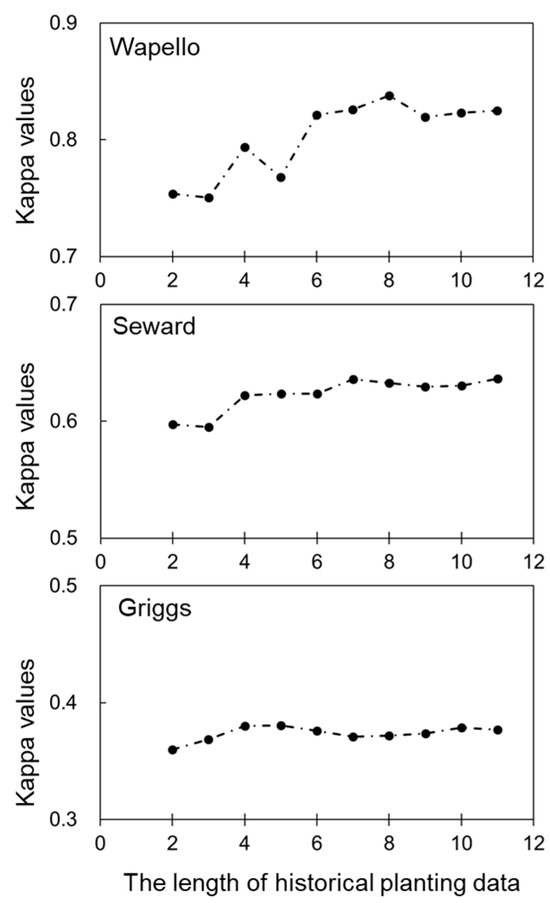 The performance of CDL-based crop classification (Kappa values) using different numbers of years of historical planting data at the three U.S. sites.