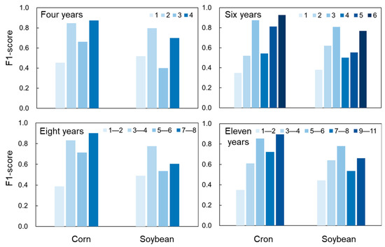 We first tested the performance of CDL-based crop classification using different numbers of years of CDL data prior to 2020. The results show that corn–soybean rotation patterns can be learned from approximately 5–6 years of historical CDL data, thus reaching a stable performance (Figure 9). We further used crop planting frequency as a surrogate to quantify crop rotation patterns. Specifically, we analyzed the number of times that corn and soybean were planted in the past 4, 6, 8, and 11 years before 2020. Pixels from the three sites were combined in this analysis. Both corn and soybean showed obviously better identification accuracy with two planting frequencies: continuous planting or planting in about half of the number of years (Figure 10). For example, higher F1 scores occur when identical crops were planted in 3 and 6 years in the past 6 years, and in 5–6 years and 9–11 years in the past 11 years.